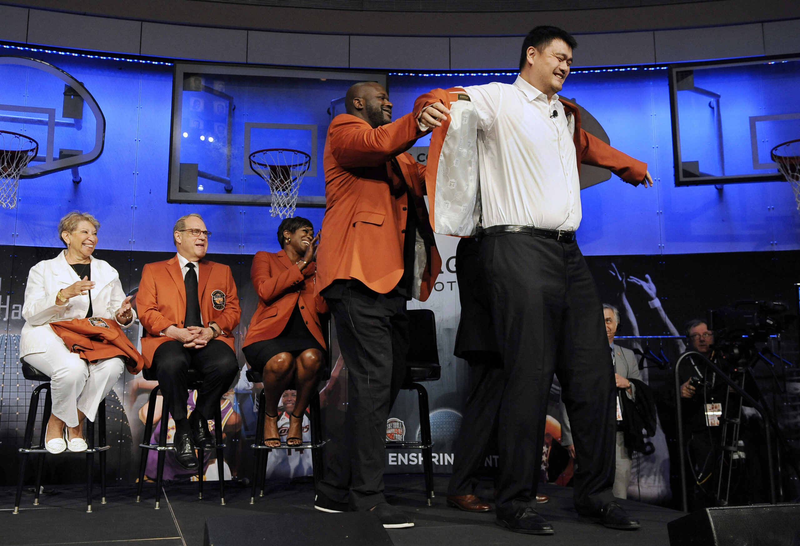Basketball Hall of Fame inductee Shaquille O’Neal helps fellow inductee Yao Ming with his jacket during a news conference at the Naismith Memorial Basketball Hall of Fame in 2016.